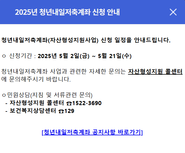 청년내일저축계좌는 청년의 저축을 통한 자산형성을 지원하여 청년이 교육, 주거, 창업 등 미래에 투자하고, 위기에 대비할 수 있도록 지원하는 정부 지원 제도입니다. 지원대상이 된다면 내가 저축한 금액을 정부가 매칭 지원금을 지원하여 목돈을 마련할 수 있도록 도와줍니다.